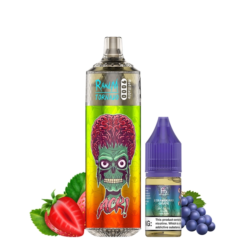 Diese neuen Tornado 9000 werden mit einem 10ml-Tank und einer 10ml-Flasche Fumot RandM Tornado Liquid mit 2% Nikotinsalz geliefert, aber Sie können eine zweite 10ml-Flasche separat kaufen, um Ihren Puff wieder vollständig zu füllen, wenn er leer ist, und so etwa 9000 Züge zu genießen.