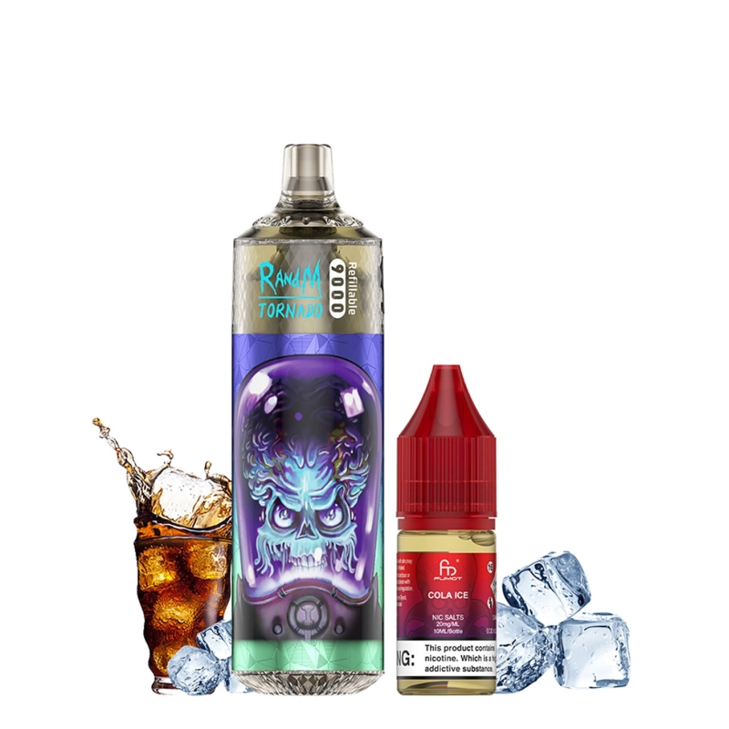 Diese neuen Tornado 9000 werden mit einem 10ml-Tank und einer 10ml-Flasche Fumot RandM Tornado Liquid mit 2% Nikotinsalz geliefert, aber Sie können eine zweite 10ml-Flasche separat kaufen, um Ihren Puff wieder vollständig zu füllen, wenn er leer ist, und so etwa 9000 Züge zu genießen.