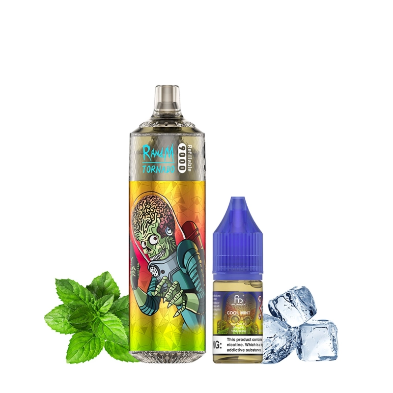 Diese neuen Tornado 9000 werden mit einem 10ml-Tank und einer 10ml-Flasche Fumot RandM Tornado Liquid mit 2% Nikotinsalz geliefert, aber Sie können eine zweite 10ml-Flasche separat kaufen, um Ihren Puff wieder vollständig zu füllen, wenn er leer ist, und so etwa 9000 Züge zu genießen.