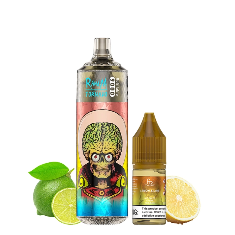 Diese neuen Tornado 9000 werden mit einem 10ml-Tank und einer 10ml-Flasche Fumot RandM Tornado Liquid mit 2% Nikotinsalz geliefert, aber Sie können eine zweite 10ml-Flasche separat kaufen, um Ihren Puff wieder vollständig zu füllen, wenn er leer ist, und so etwa 9000 Züge zu genießen.