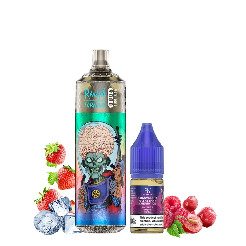 Diese neuen Tornado 9000 werden mit einem 10ml-Tank und einer 10ml-Flasche Fumot RandM Tornado Liquid mit 2% Nikotinsalz geliefert, aber Sie können eine zweite 10ml-Flasche separat kaufen, um Ihren Puff wieder vollständig zu füllen, wenn er leer ist, und so etwa 9000 Züge zu genießen.