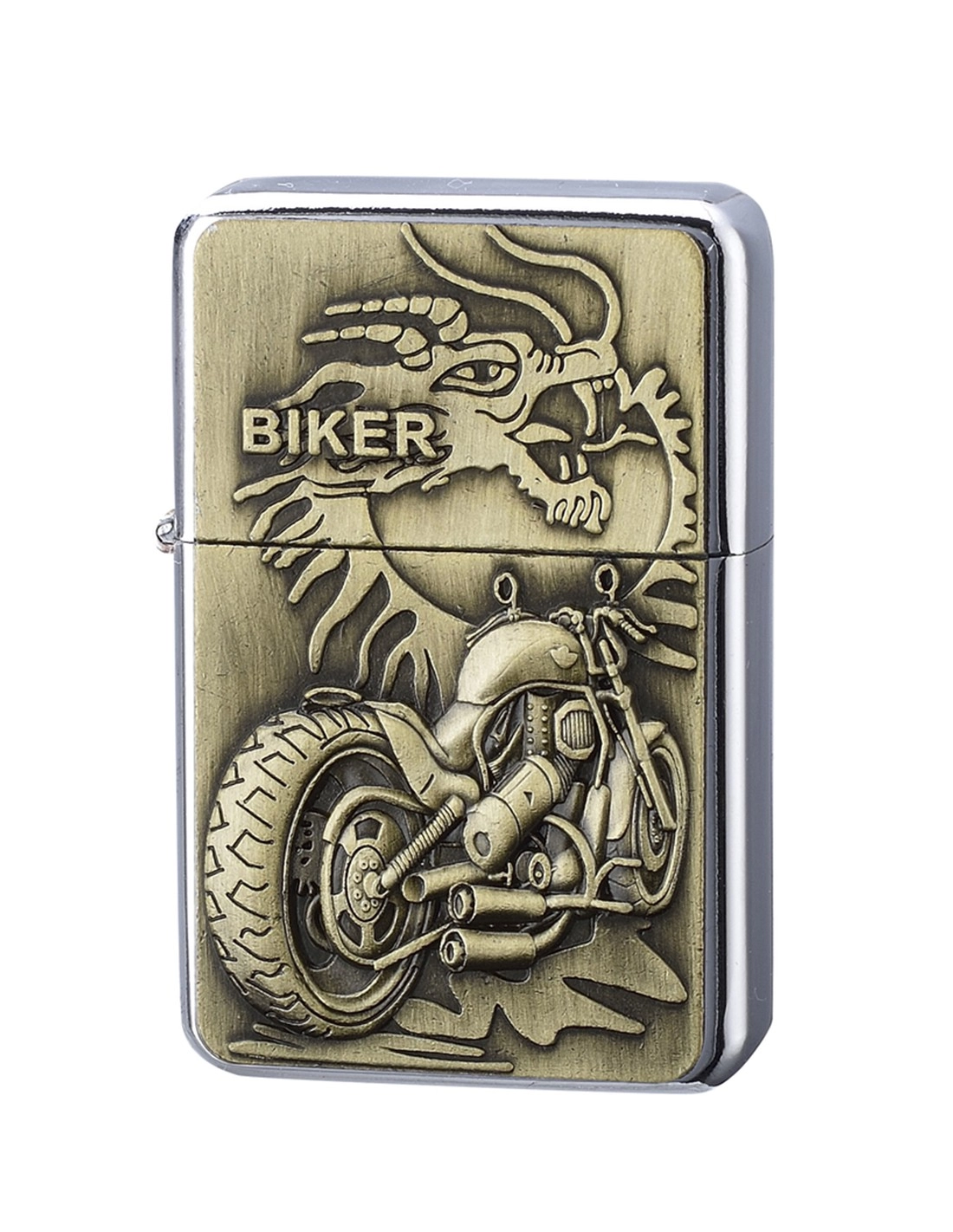 Benzinfeuerzeug vom Typ Zippo aus silber- und goldfarbenem Metall mit der Abbildung eines Motorrads und eines Drachen sowie der Aufschrift Biker. Für den Gebrauch benötigst du Zippo-Benzin.