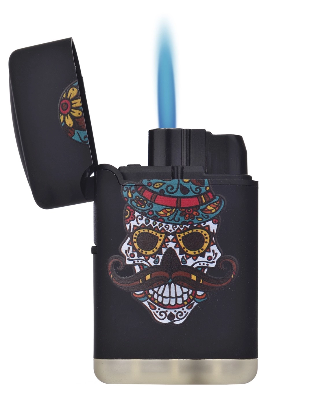 Sturmfeuerzeug mit Gas und der Abbildung eines Totenschädels, der Sonnenbrille und Schnurrbart trägt. Dank der blauen Flamme kann man das Feuerzeug auch bei starkem Wind benutzen.