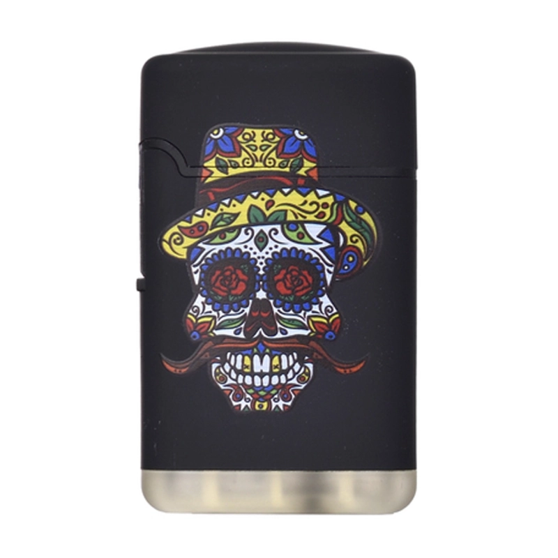 Sturmfeuerzeug mit Gas und der Abbildung eines Totenschädels, der einen Schnurrbart und Rosen in den Augen trägt. Dank der blauen Flamme kann man das Feuerzeug auch bei starkem Wind benutzen.