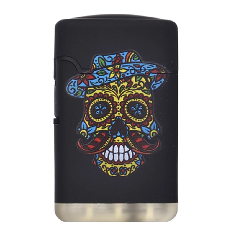 Sturmfeuerzeug mit Gas und der Abbildung eines Totenschädels, der einen Schnurrbart und blaue Sterne in den Augen trägt. Dank der blauen Flamme kann man das Feuerzeug auch bei starkem Wind benutzen.
