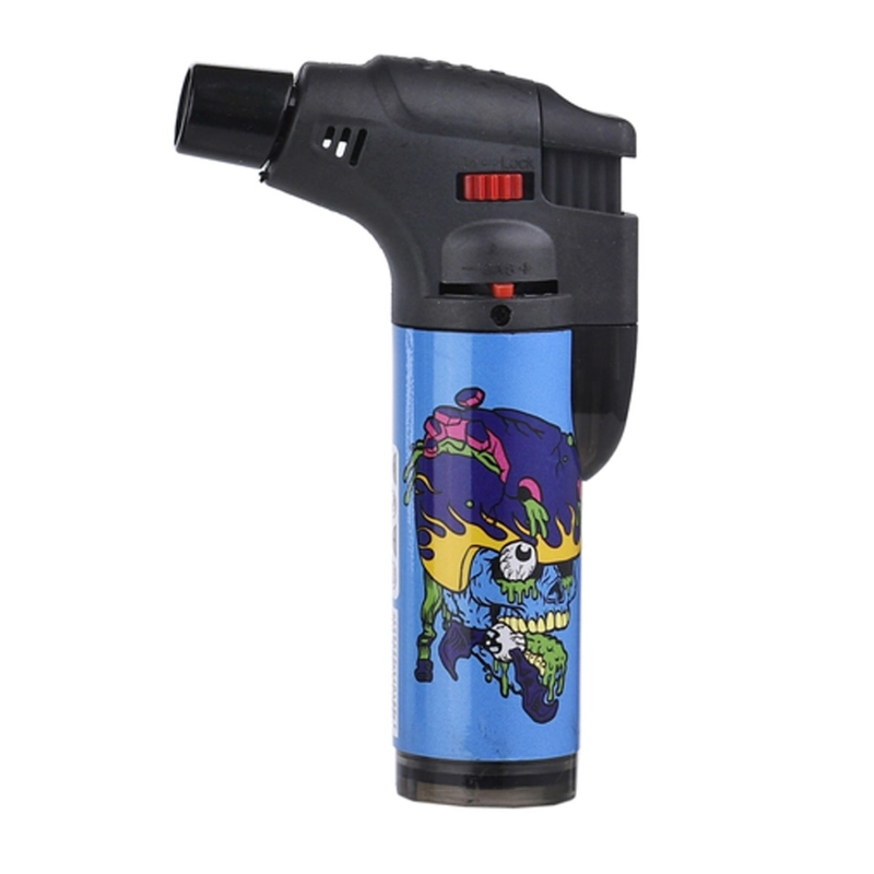 EasyTorch Gasbrenner in Blau mit einem verrückten Totenkopf. Mit diesem Sturmfeuerzeug kannst du deine Zigarette auch bei starkem Wind anzünden. Es verfügt über einen Mechanismus, mit dem sich die Flamme regulieren lässt.
