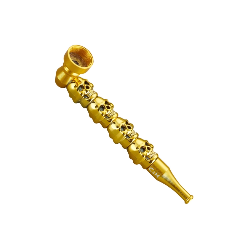 Goldfarbene Metallpfeife der Marke Champ High mit einer Länge von 12,4 cm und einem Röhrchen, das aus 4 Totenköpfen besteht. Diese Pfeife eignet sich perfekt, um Gras oder CBD-Hash ganz ohne Tabak zu rauchen.