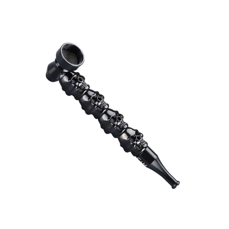 Schwarze Metallpfeife der Marke Champ High mit einer Länge von 12,4 cm und einem Röhrchen, das aus 4 Totenköpfen besteht. Diese Pfeife eignet sich perfekt, um Gras oder CBD-Hash ganz ohne Tabak zu rauchen.