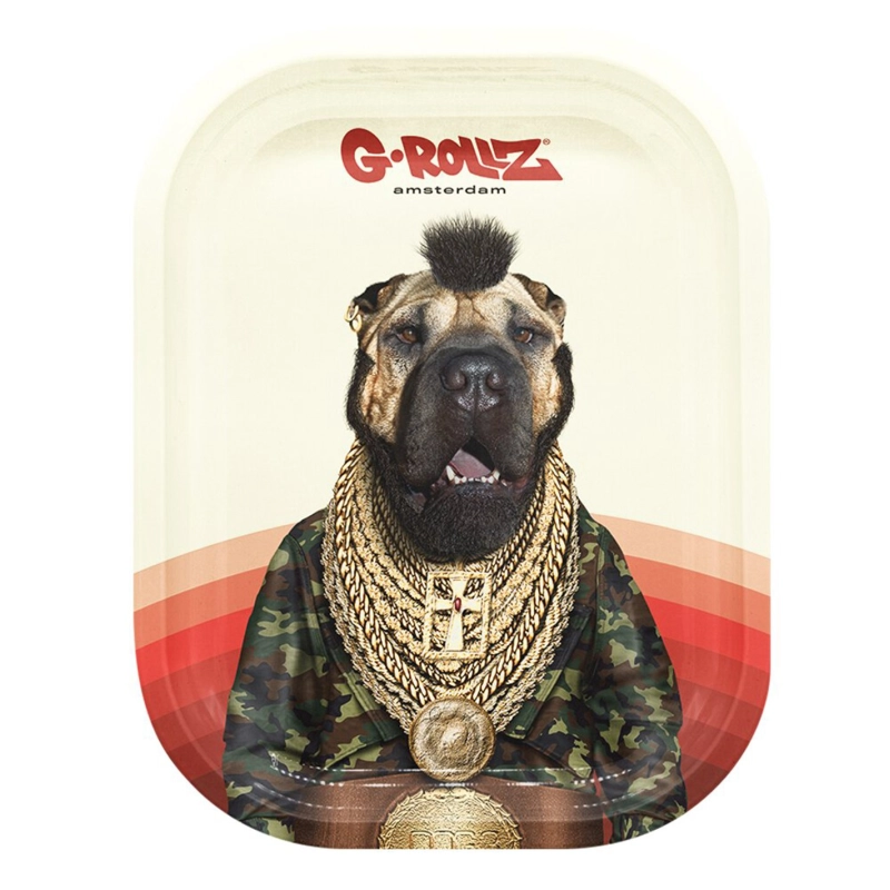 Mischbrett aus Metall der Marke G Rollz in der Farbe Cremeweiss. Es besitzt eine Grösse von 14 x 18 cm und besticht durch die Abbildung eines Hundes, der stark an den legendären Mister T aus dem A-Team erinnert.