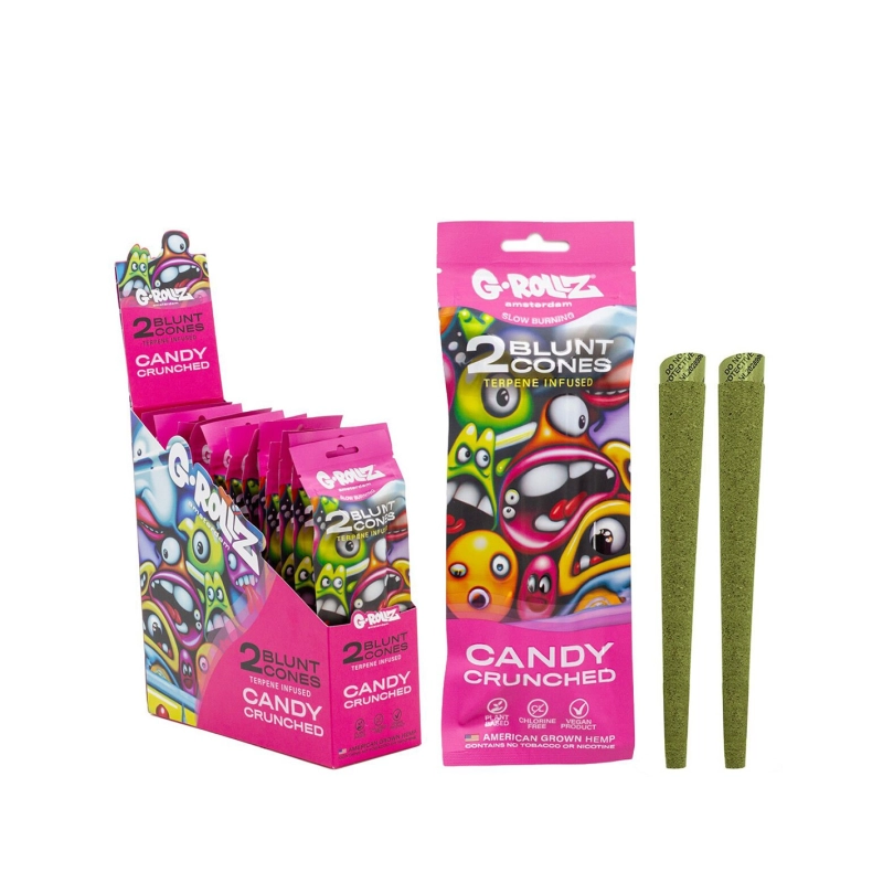 Die vorgerollten Blunts der Marke G Rollz mit verlockendem Candy-Crunched-Aroma sind im 2er-Pack erhältlich. Sie sind im Gegensatz zu herkömmlichen Blunts aus Bio-Hanf hergestellt und enthalten keinen Tabak.