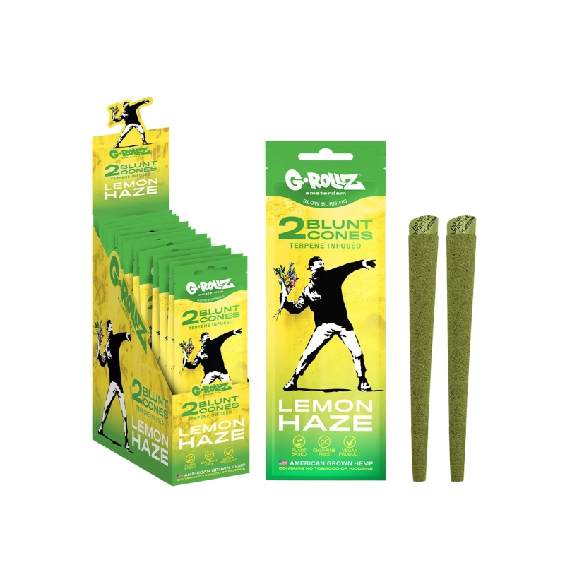 Die vorgerollten Blunts der Marke G Rollz mit verlockendem Lemon-Haze-Aroma sind im 2er-Pack erhältlich. Sie sind im Gegensatz zu herkömmlichen Blunts aus Bio-Hanf hergestellt und enthalten keinen Tabak.