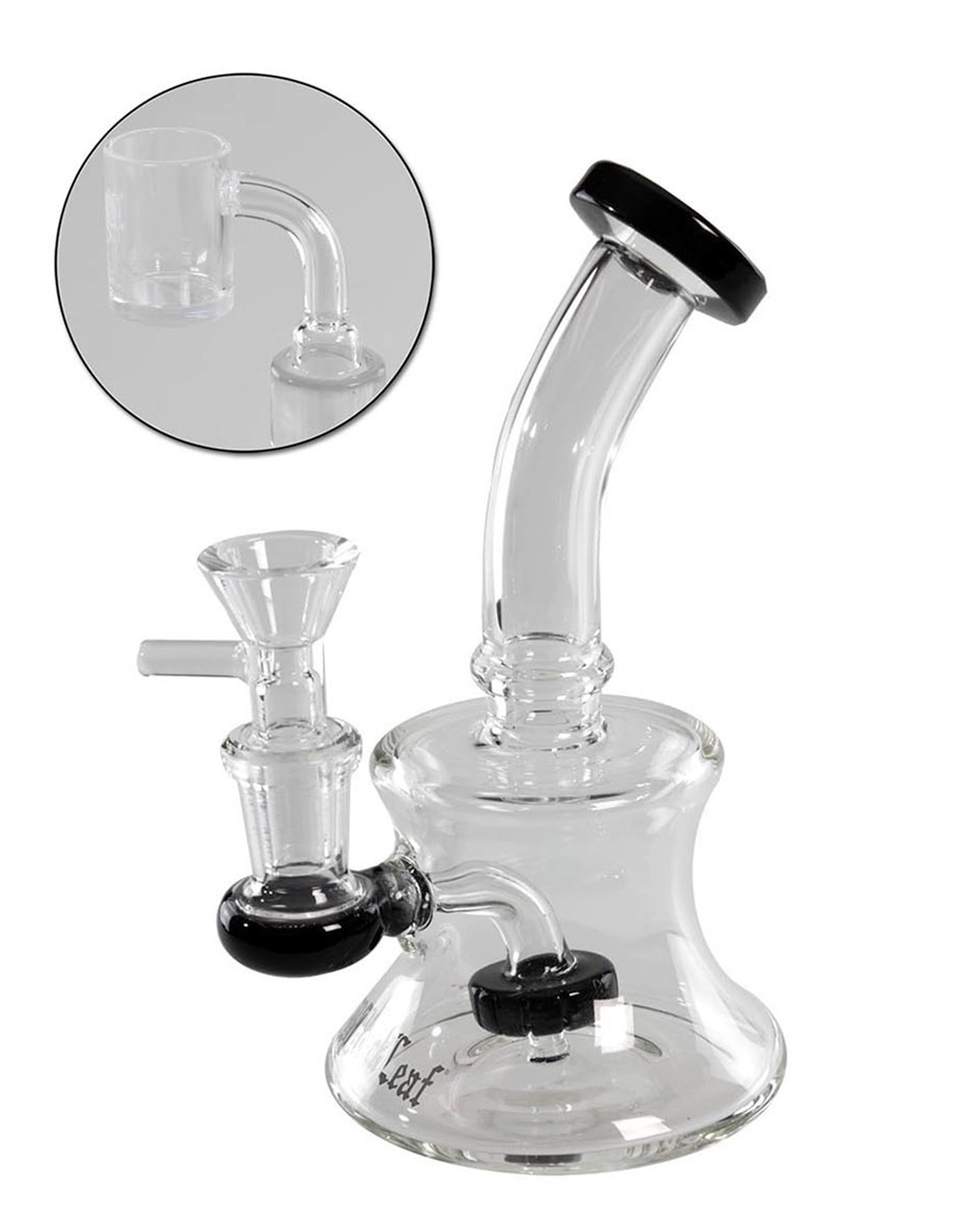 Die kleine Kombi-Bong eignet sich zum Genuss von Kräutern sowie auch zum Genuss von Öl und Wax. Sie ist daher mit einem Banger und einem Trichterkopf mit Lift-Off-Griff (da es kein Kickloch gibt) ausgestattet. Der Kräuterkopf hat einen mittelgroßen Durchlass.