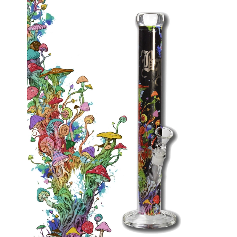 Exquisite Glasbong MUSHROOM TREE von Black Leaf® mit faszinierendem All-Over-Print, exklusiv für uns designed von SLY. Hergestellt ist die straighte Zylinderbong aus 5mm starkem Borosilikatglas-Rohr. Daher ist die Bong robust, schwer und sehr standfest.
