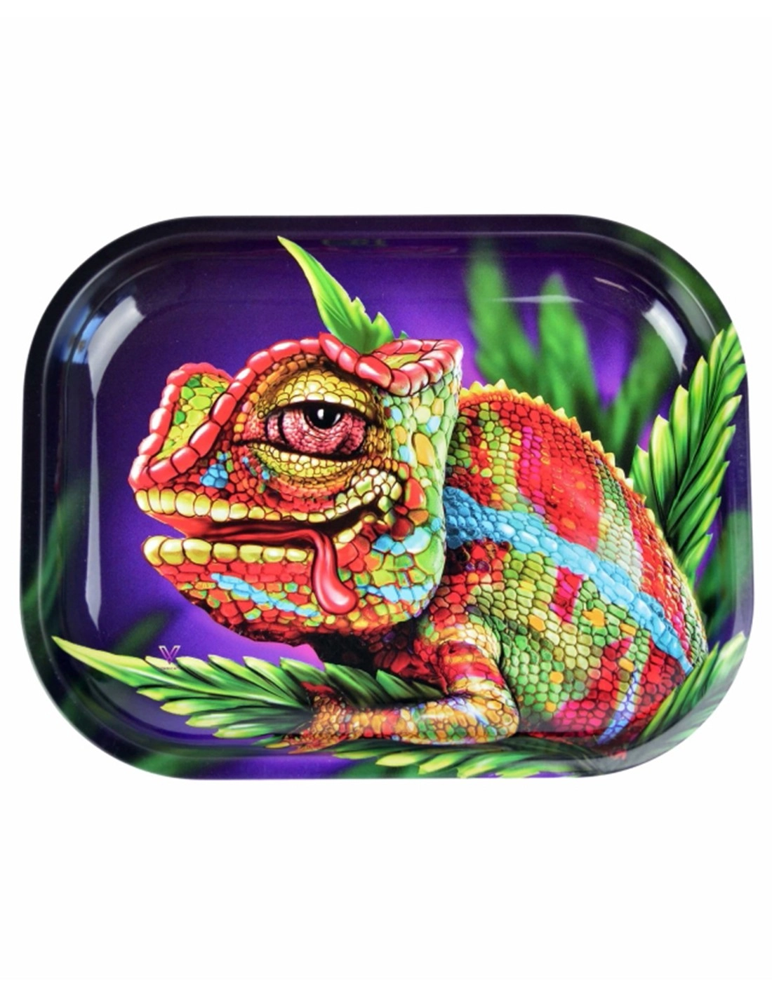Metall-Mischbrett der Marke V Syndicate mit der Abbildung eines bunten, bekifften Chamäleons. Dieses Mischbrett ist perfekt, um beim Drehen eines Joints zu vermeiden, dass der Mix überall landet.