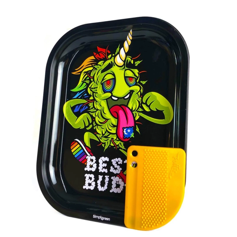 Dieses schwarze Mischbrett aus Metall ist 18 x 14 cm gross und kommt mit der Darstellung einer völlig bekifften Hanfknospe, die gerade LSD genommen hat, daher. Das Tablett verfügt zudem über eine magnetische Grinder Card, die direkt daran befestigt werden kann.