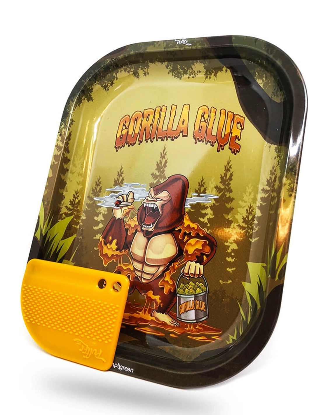 Dieses 18 x 14 cm grosse Mischbrett aus Metall zeigt einen Gorilla, der mit einem Eimer voller Cannabis der Sorte Gorilla Glue umherläuft und dabei einen Joint raucht. Das Mischbrett kommt ausserdem mit einer magnetischen Grinder Card daher, die direkt an einer Ecke des Bretts befestigt wird. Somit ist kein klassischer Grinder mehr nötig.