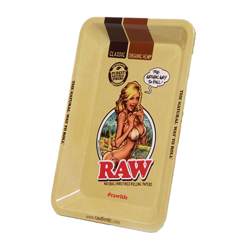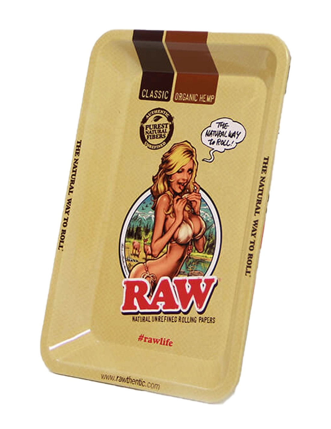 Dieses beigefarbene Mix-Tablett aus Metall von der bekannten Zigarettenpapiermarke RAW ist 18 x 14 cm gross und zeigt das Bild einer Blondine im Bikini. Echt praktisch, wenn du einen Joint drehen willst, ohne alles vollzukrümeln.