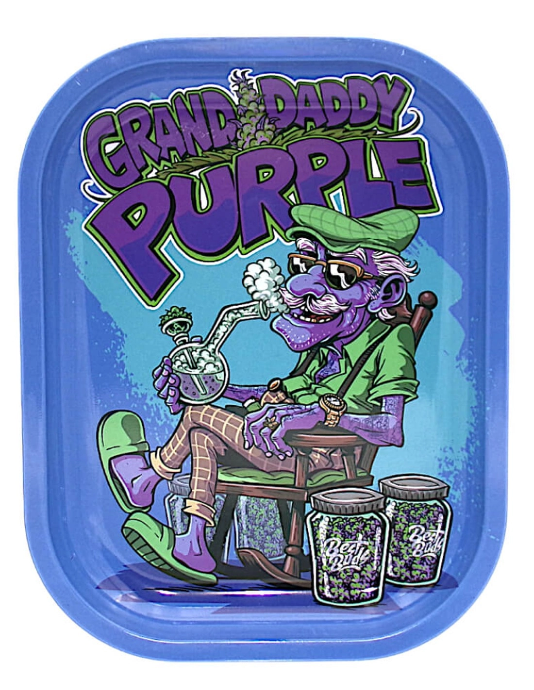 Mischbrett aus Metall in den Massen 18 x 14cm mit der Darstellung eines alten Mannes, der eine Bong in der Hand hält und genüsslich sein Purple-Weed raucht.