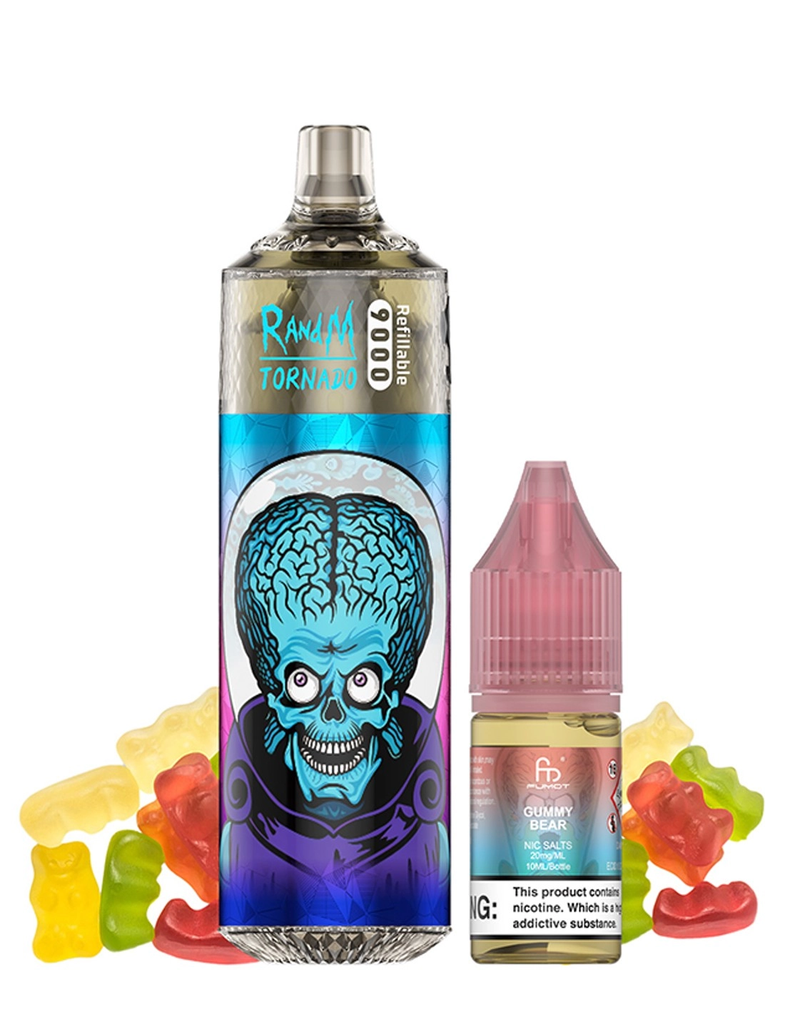 Diese neuen Tornado 9000 werden mit einem 10ml Tank und einer 10ml Flasche Tornado RandM Fumot Liquid mit 2% Nikotinsalz geliefert, aber Sie können separat eine zweite 10ml Flasche kaufen, um Ihren Puff voll zu füllen, wenn er leer ist, und so die 9000er Ziehung genießen zu können.