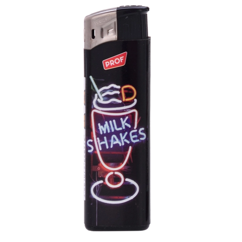 Elektronisches Feuerzeug mit einem Milchshake-Neonschild. Dieses Feuerzeug kann jederzeit mit Feuerzeuggas nachgefüllt werden.