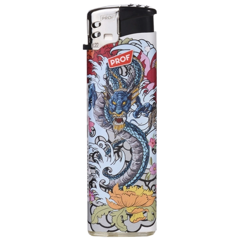 Elektronisches Feuerzeug der Marke Prof, nicht nachfüllbar, verziert mit einem blauen chinesischen Drachen.
