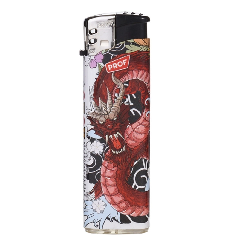 Nicht wiederaufladbares elektronisches Feuerzeug der Marke Prof, verziert mit einem roten chinesischen Drachen.