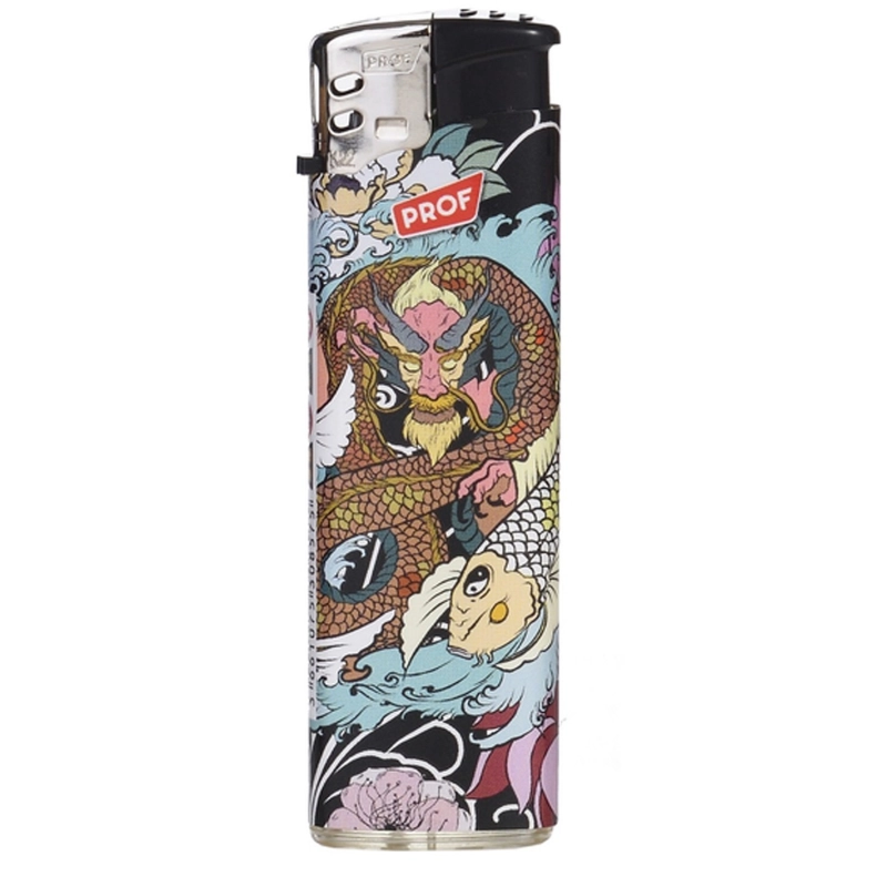 Elektronisches Feuerzeug der Marke Prof, nicht nachfüllbar, verziert mit einem gelben chinesischen Drachen.