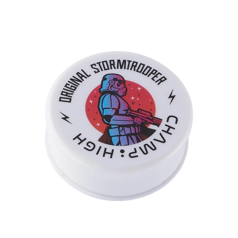 Kunststoff-Grinder der Marke Champ High, 3-teilig, mit einem Durchmesser von 60 mm. Dieser Grinder ist mit einem Motiv aus dem Film Star Wars verziert, das einen Stormtrooper vor rotem Hintergrund zeigt.