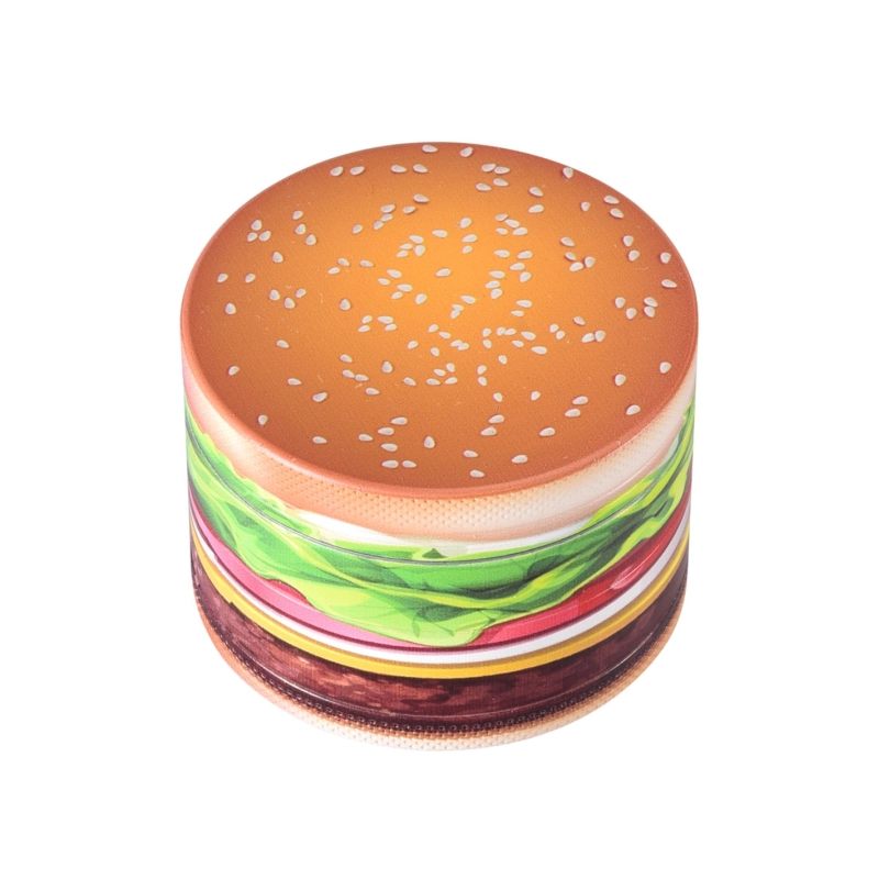 Metallgrinder der Marke Champ High in Form eines Hamburgers. Dieser Grinder besteht aus 4 Teilen, darunter einem Teil zum Sammeln des Pollens Ihrer Lieblingskräuter.