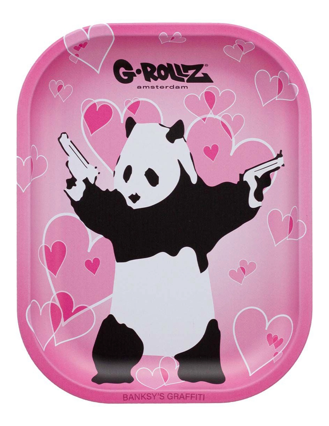 Dieses Mischbrett aus Metall der Marke G Rollz ist äusserst praktisch, wenn man nicht alles vollkrümeln möchte. Es ist rosa und mit dem Bild eines bewaffneten Pandabären dekoriert.