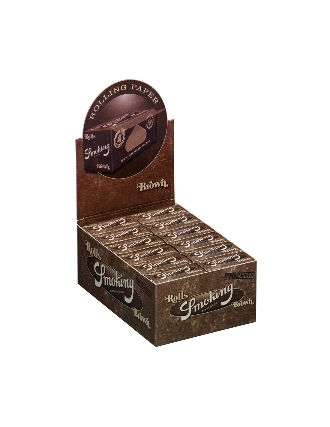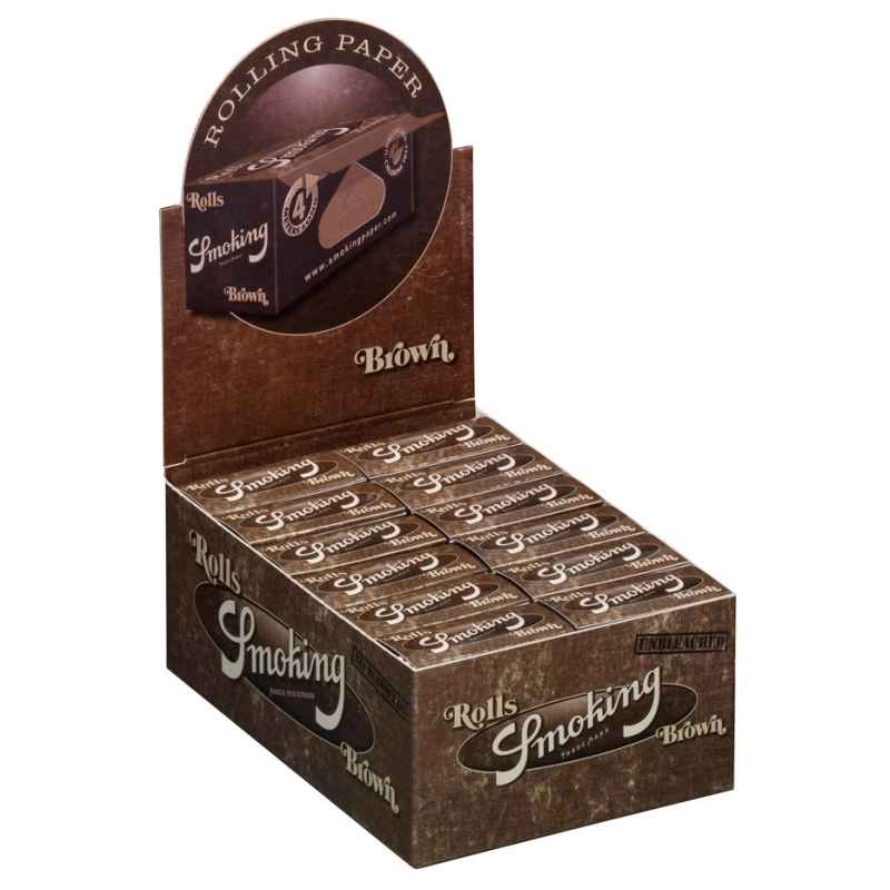 Smoking setzt Maßstäbe und bietet ein 100% natürliches und ungebleichtes braunes Zigarettenpapier an. Der Karton besteht aus 24 Rollen von 4m Länge. Der Klebstoff besteht wie bei allen Smoking-Produkten aus Gummi arabicum.