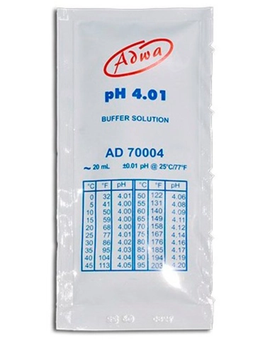 Eichflüssigkeit pH 4,01 der Marke Adwa zum Kalibrieren Ihres pH-Messgeräts, verpackt in einem Beutel mit ca. 20 ml Inhalt.