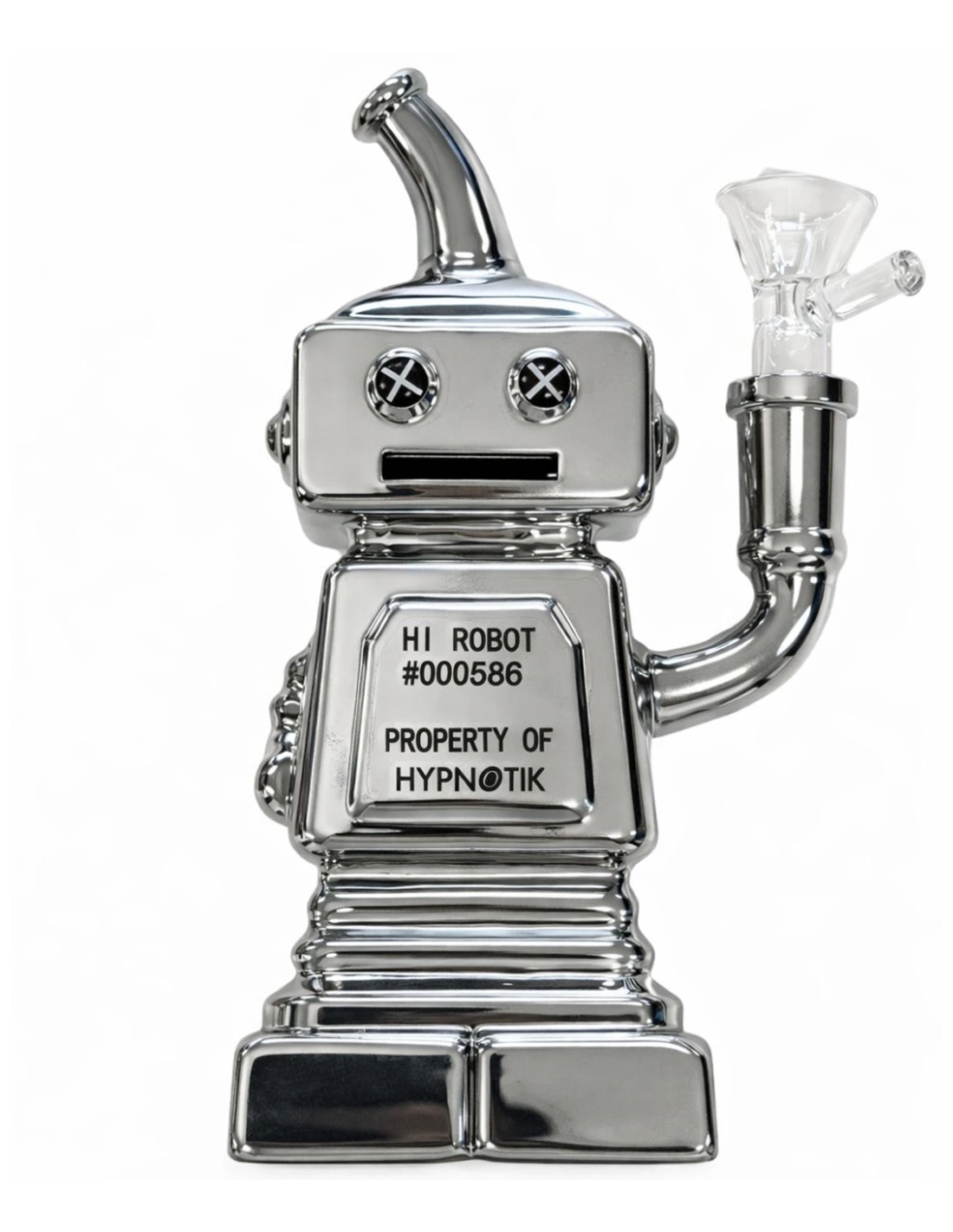 Diese kompakte, 16 cm lange Bong besticht durch ihr skulpturales, von einem Roboter inspiriertes Design und vereint thematische Optik mit den Standardfunktionen einer Wasserpfeife in einem platzsparenden Format.