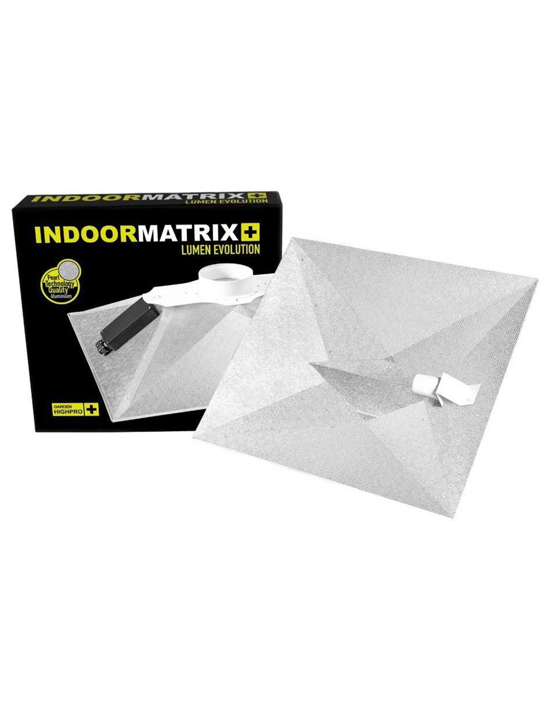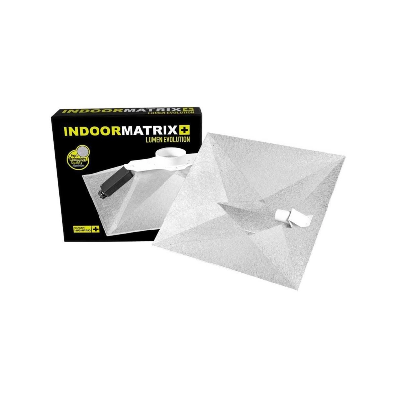 Reflektor aus Aluminium mit einer Reflexionsfähigkeit von 97% und 35% mehr Ausleuchtung in den Ecken. Dank des innovativen Belüftungssystems, leitet der Matrix die vom Leuchtmittel erzeugte Wärme ab. Bis zu 13,8°C weniger Wärme an den Pflanzenspitzen.