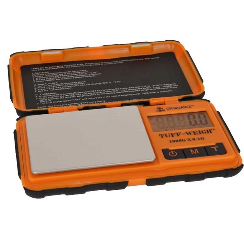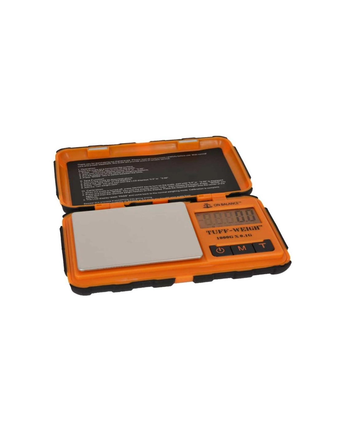 Mit On Balance ist diese tragbare digitale Präzisionswaage von Tuff-Weigh für Ihre schwierigsten Aufgaben freigestellt! Es ist voller Funktionen wie: - 1.000 Gramm Kapazität, 0,1 Gramm Auflösung - Orange Hartplastik-Etui mit Gummigriffen - Extra große 14-mm-Anzeige Ziffern gegen eine leuchtend orange Hintergrundbeleuchtung - 6 Wägemodi gehören Gramm, Unzen, Feinunzen, Pennyweights , Karat und Körner - 76 x 59mm Edelstahl-Tablett - Wählbare Auto-Off ermöglicht es Ihnen, die Auto-Off-Zeit nach Ihren Bedürfnissen zu ändern - Abnehmbarer Deckel dient auch als Fach - Überladungsschutz - Powered by 2 AAA-Batterien (im Lieferumfang enthalten)