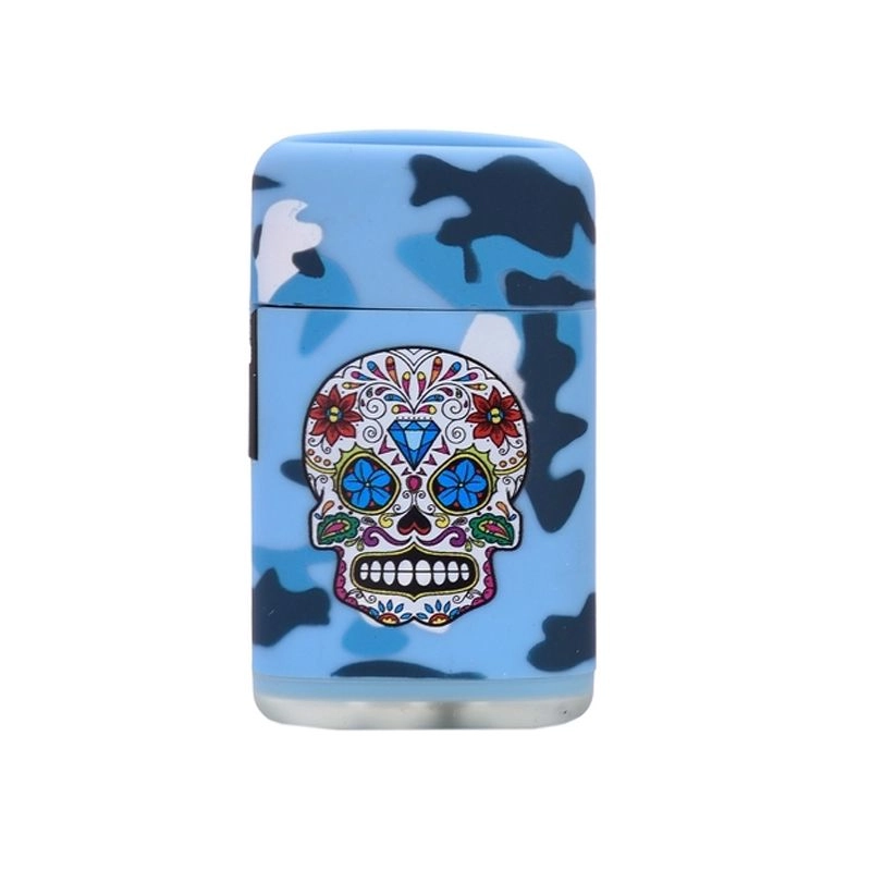Nachfüllbares Sturmfeuerzeug mit Klappe (wie bei einem Zippo) in Blau mit mexikanischem Totenkopfmotiv.