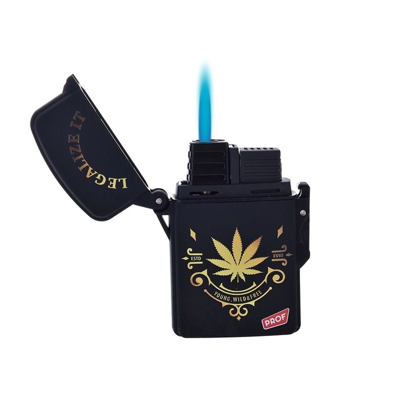 Nachfüllbares Sturmfeuerzeug mit Klappe (wie bei einem Zippo) in Schwarz. Mit goldenem Schriftzug "Legalize It".