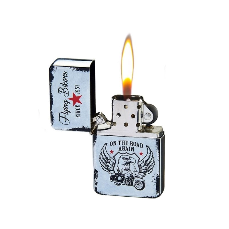 Nachfüllbares Benzinfeuerzeug aus Metall mit dem Bild eines Motorrads und Flügel.