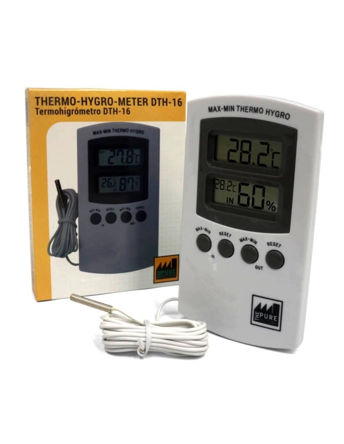Thermo- und Hygrometer, das Sie in Ihrer Growbox verwenden können, um die Temperatur und die Luftfeuchtigkeit in Ihrem Growroom zu kontrollieren. Mit der Sonde können Sie die Aussenseite Ihrer Box überprüfen.