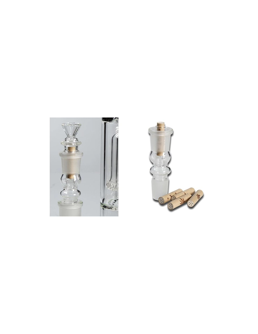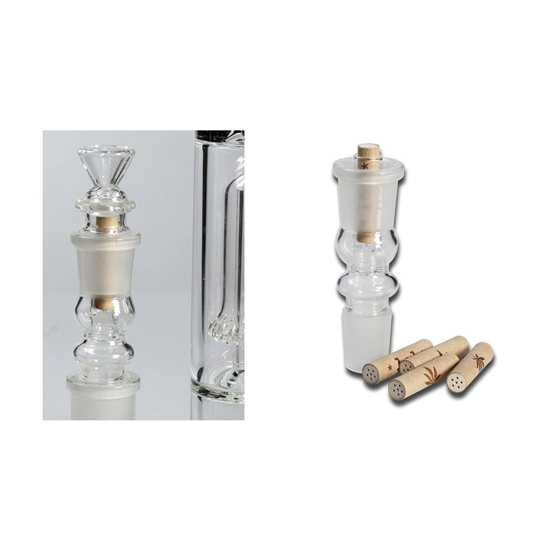 Dieser Bongadapter aus hitzebeständigem Borosilikatglas, passend auf alle Pfeifen mit 18,8mm Normschliff, wird inklusive 5x8mm Standard-Aktivkohlefilter der Marke 'lol' geliefert.