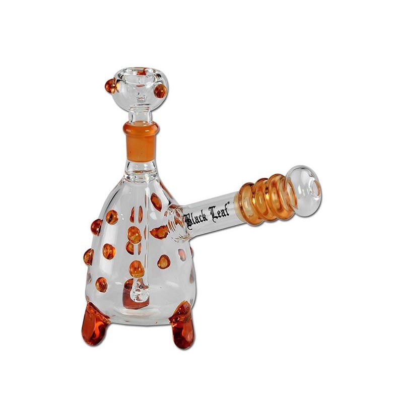 Schnuckelige und sehr griffige Wasserpfeife von Black Leaf® mit Glaselementen in fröhlichen Farben. Der Lochperkolator im Shillum sorgt im Inneren der kleinen Pfeife für kühlendes Geblubber, während der Rauch bequem durch das ergonomische Mundstück inhaliert werden kann. Der Flutschkopf für Kräuter rollt dank der drei Glasnoppen nicht vom Tisch.