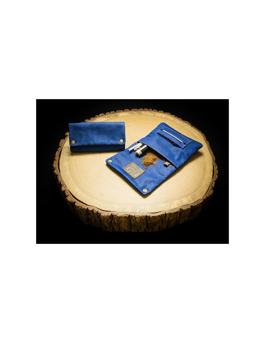 Die Drehtasche in knalligem Blau hat zwei Innenfächer, das hintere ist für die Tabakmischung und die vordere für wichtige Utensilien wie Tips und Feuerzeug. Dazu enthält die Tasche eine Bauunterlage und einen Stopfer aus Holz sowie eine Haltevorrichtung für Papers. Damit nichts verloren geht, wird die Jointtasche mit einem Druckknopf verschlossen, zwei Ersatzknöpfe liegen ebenfalls dabei.