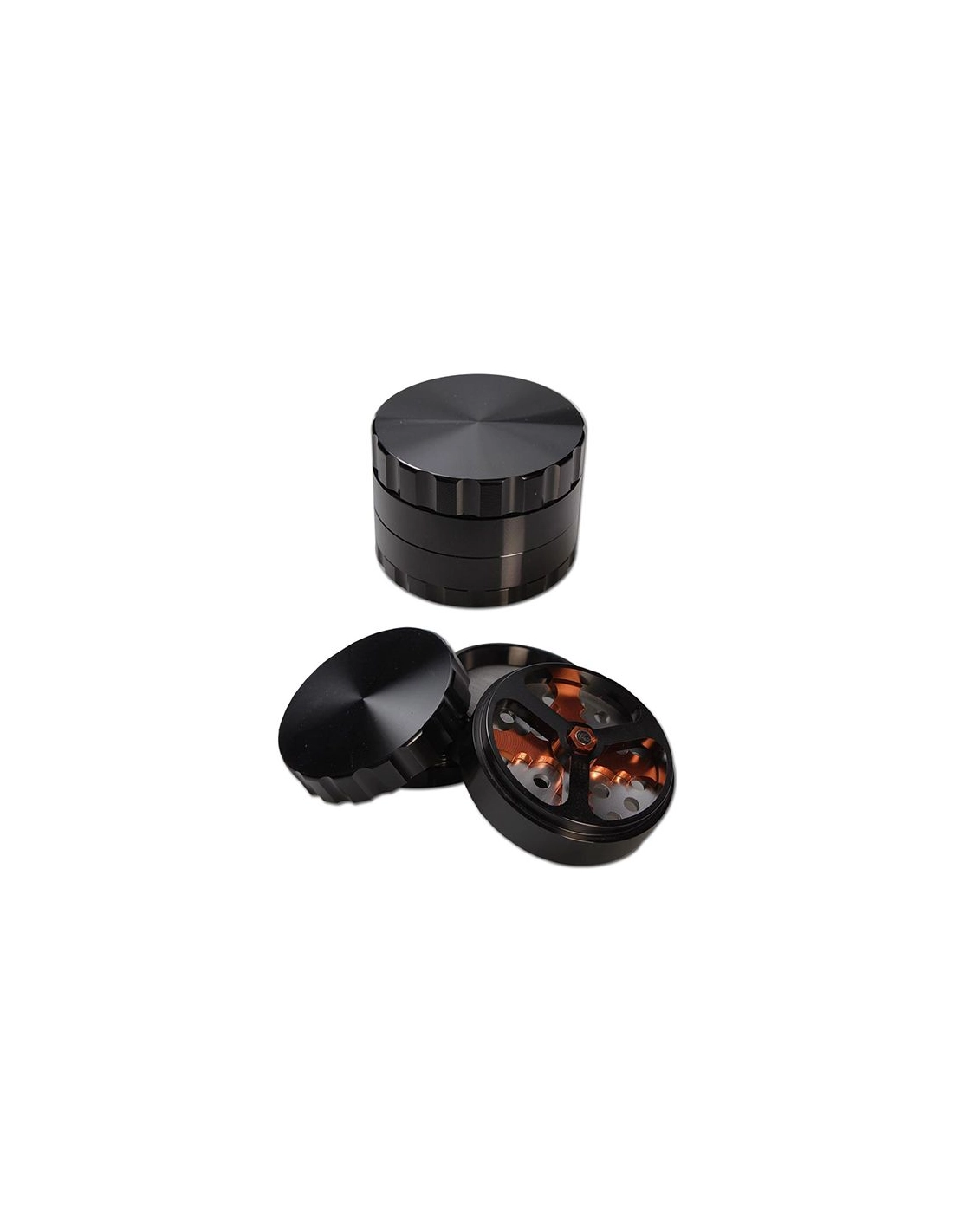 Die Mühle 'Propeller' aus Aluminium hat ein silber-/bronzefarbenes Mahlwerk im Design von Propellern mit scharfen Kanten. Dank der cleveren Mechanik und der Aussparung im Deckel drehen sich die Propeller im Inneren beim geschlossenen Grinder mit, wenn man den Deckel wie üblich dreht.