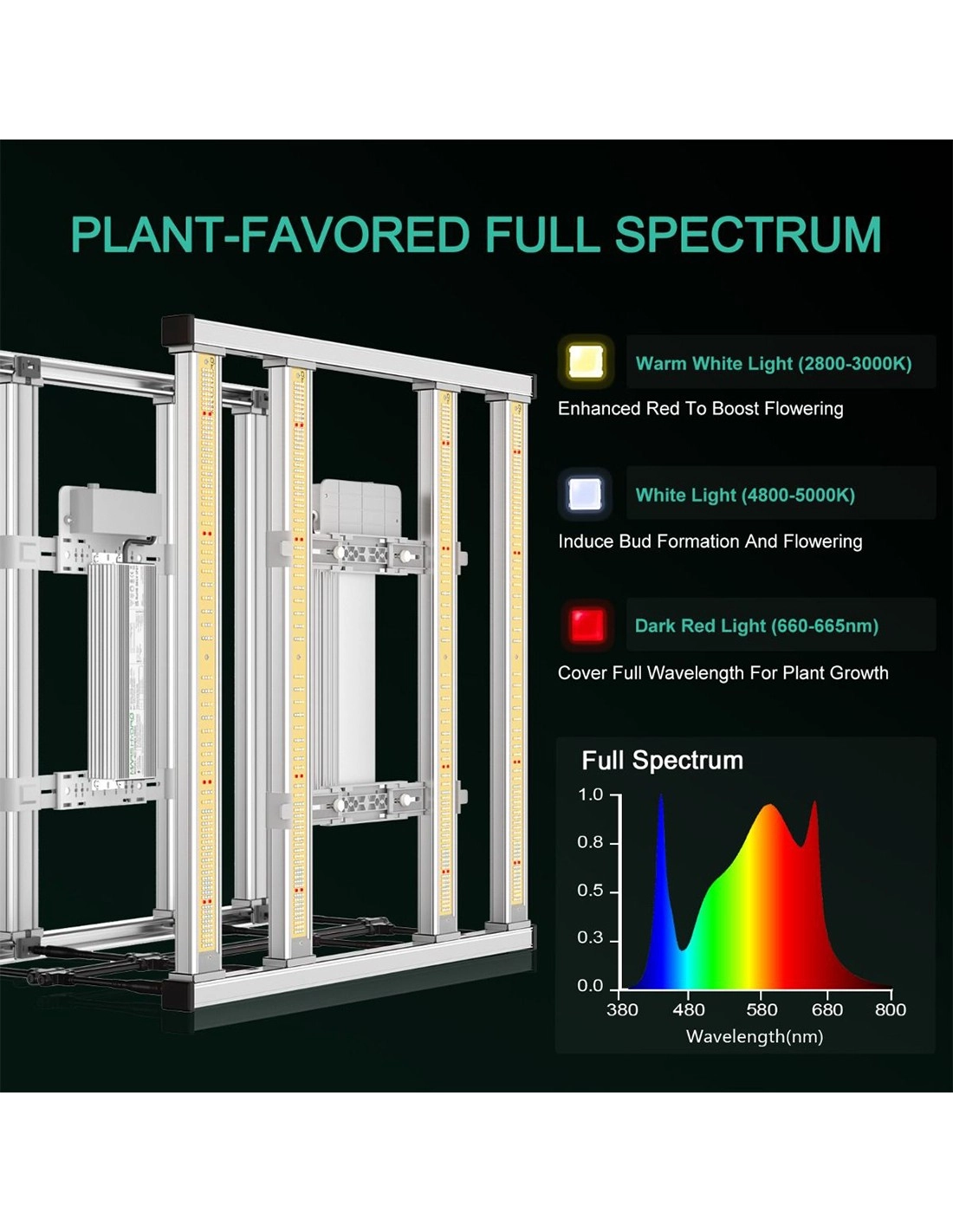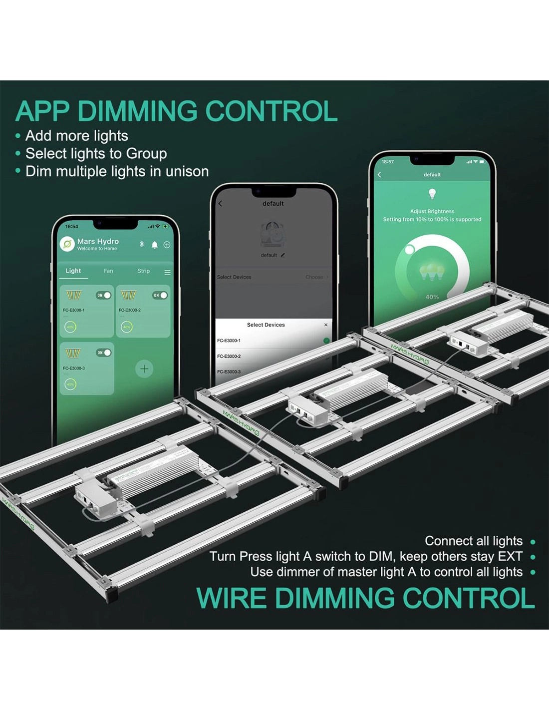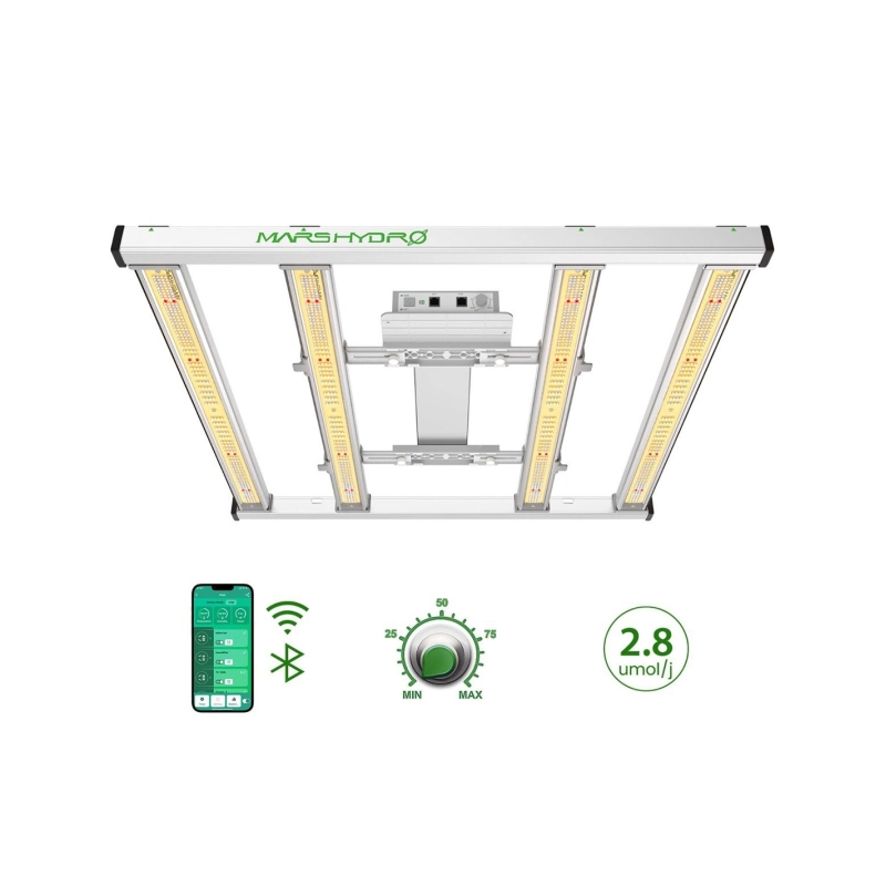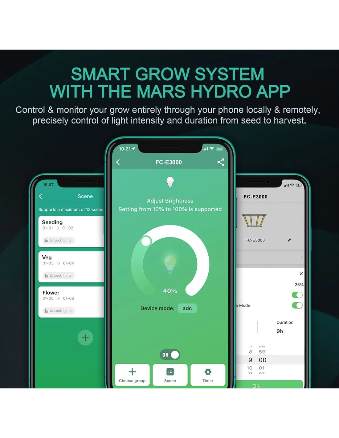 Die Mars Hydro Smart FC-E3000 ist eine 300-Watt-LED-Anbaulampe, die eine Effizienz von 2,8 μmol/d und einen Photonenfluss von 832 μmol/s bietet. Sie verfügt über weisses Vollspektrumlicht, das am besten für Pflanzen von der Aussaat bis zur Blüte geeignet ist. Die Lichtstäbe sowie das Netzteil sind abnehmbar. Der FC-E 3000 ist für den Einsatz in Zelten, für kleine kommerzielle Aussaaten oder für das vegetative Wachstum gedacht.