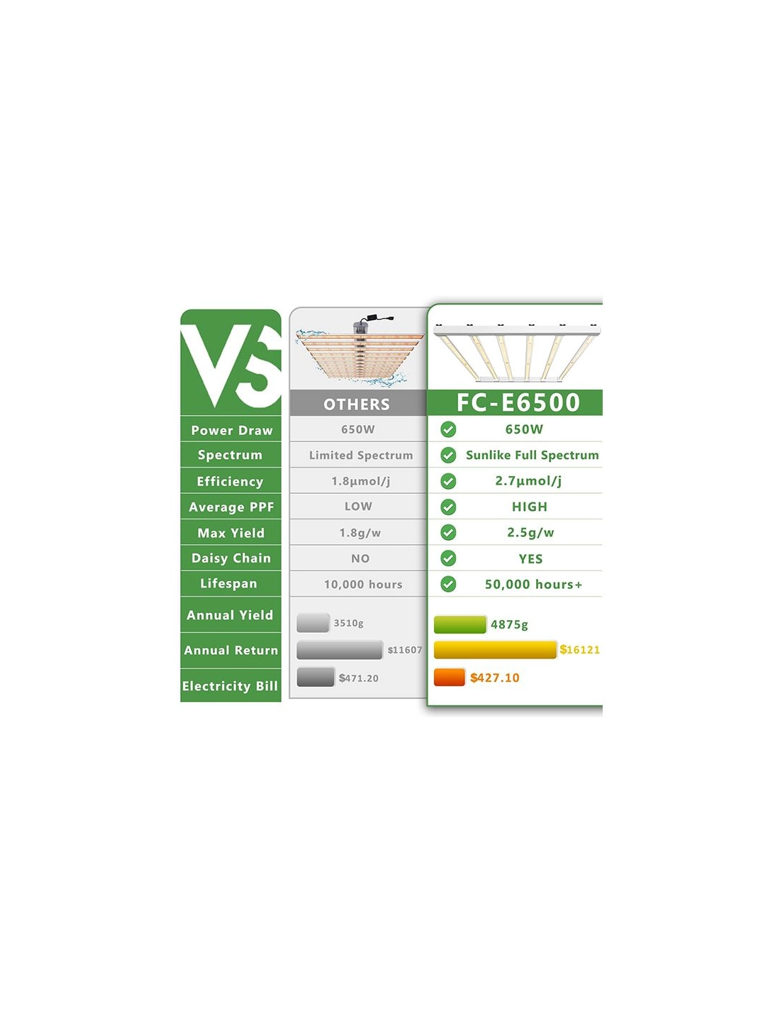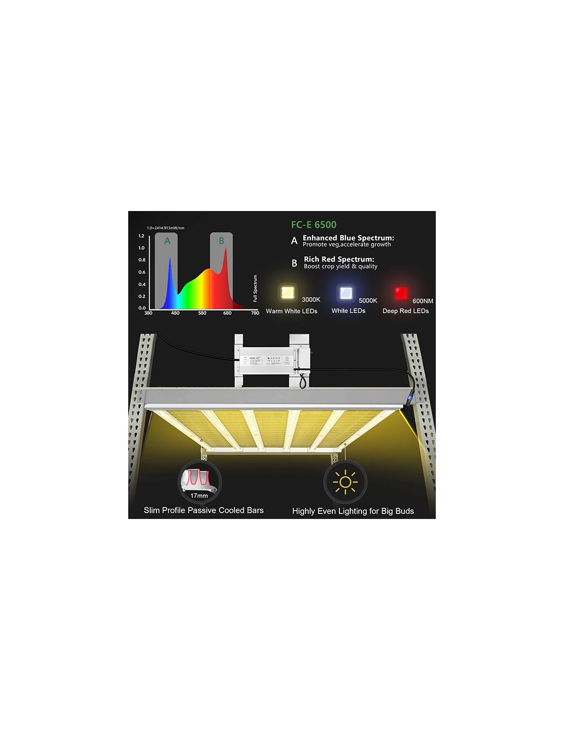 Das Mars Hydro FC E-6500 ist ein sehr leistungsstarkes LED-System für den Gartenbau. Mit seinen 650 Watt Leistung kann es Ihre MH- und HPS-Lampen perfekt ersetzen, und das mit einer Ersparnis von 30 % im Vergleich zu Lampen der älteren Generation.