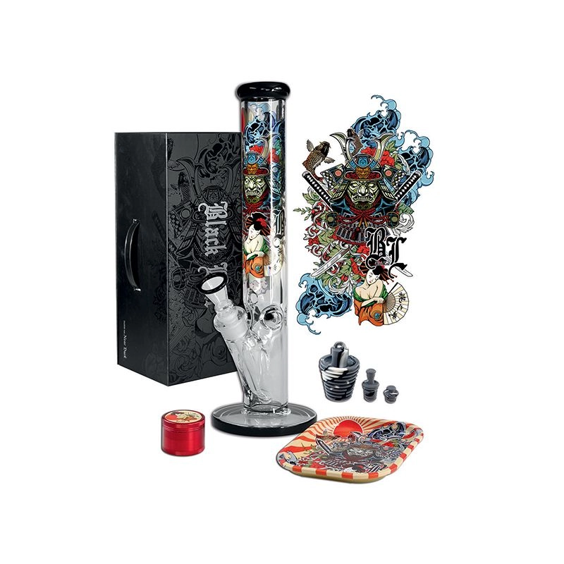 Megacooles Bong-Set von Black Leaf® mit exklusivem 'Ronin & Geisha' Design made by Sly! Da hat sich Sly mal wieder selbst übertroffen: Das ohnehin ausdrucksstarke und stylische Japan-Motiv mit dem herrenlosen Samurai, Geisha, Koikarpfen und aufgehender Sonne wird durch den schimmernden Metallic-Print besonders hervorgehoben und gibt der klassischen Zylinderbong ein gewisses Etwas, das sich schwer in Worte fassen lässt. Einfach nur Hammer!