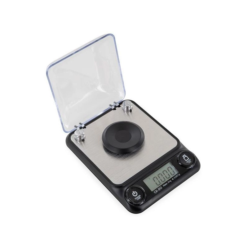 Waage CK-20 mit einer Kapazität von 20g und einer Genauigkeit auf Hundertstel-Gramm. Inklusive nützlicher Utensilien, die eine bessere Genauigkeit gewährleisten.