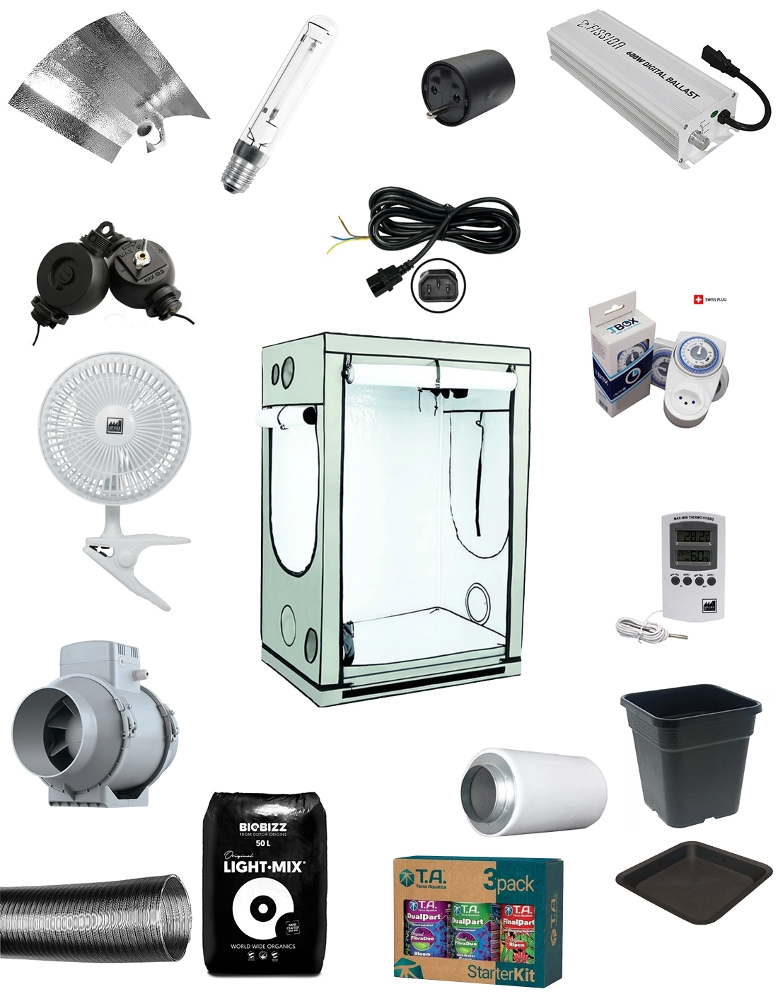 1 Homebox Ambient R120 (120x90x180cm) 1 Strapit Secret Jardin Spanngurt für Box (2St.) 1 Vorschaltgerät Wattium 600W V2 Achtung: Stellen Sie das Vorschaltgerät auf 400 W ein 1 3-poliger Euro-Schweiz-Adapter Irreversibel 1 IEC-Stecker mit 4m Kabel 1 Hammerschlagreflektor 1 Sylvania S-TS Growlux 600W (Wachstum + Blüte) 1 Easy Rollers 1 Timer TBox 1M 230V Max 3500W 1 Clip Ventilator (2-in-1) 15cm Pro-vent 1 Thermo Hygrometer 1 Abluftventilator Vents TT 160mm 595-660m3/h 1 IEC C13 Stecker - CH Stecker verdrahtet 1.8m 2 Aluconnect-Rohr 160mm 1m 3 Schlauchschellen 60-180mm 1 Kohlefilter Prima Klima 700m3/h 160mm 16 Quadratischer Topf 3.6lt 16 Unterschalen 3.6lt 1 Light mix 50lt 1 Tripack flora duo Für andere Optionen (Hydrokultur, Aerokultur, Kultur auf Kokossubstrat, andere Reflektoren, etc.) kontaktieren Sie uns bitte. Wir unterbreiten Ihnen dann ein persönliches Angebot.