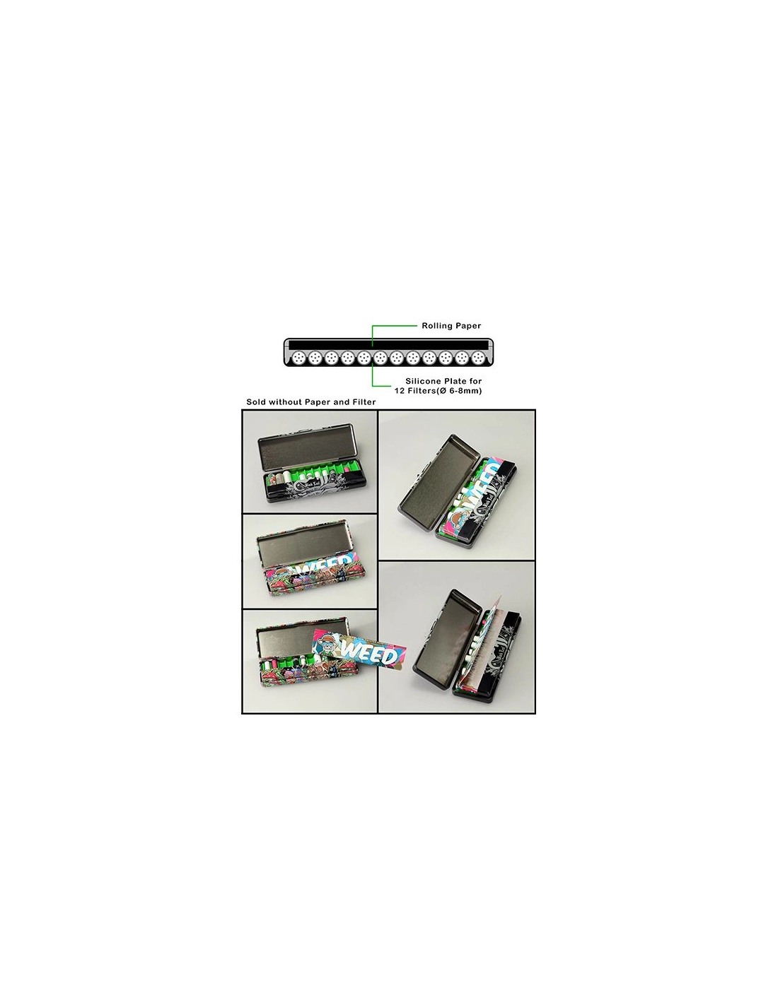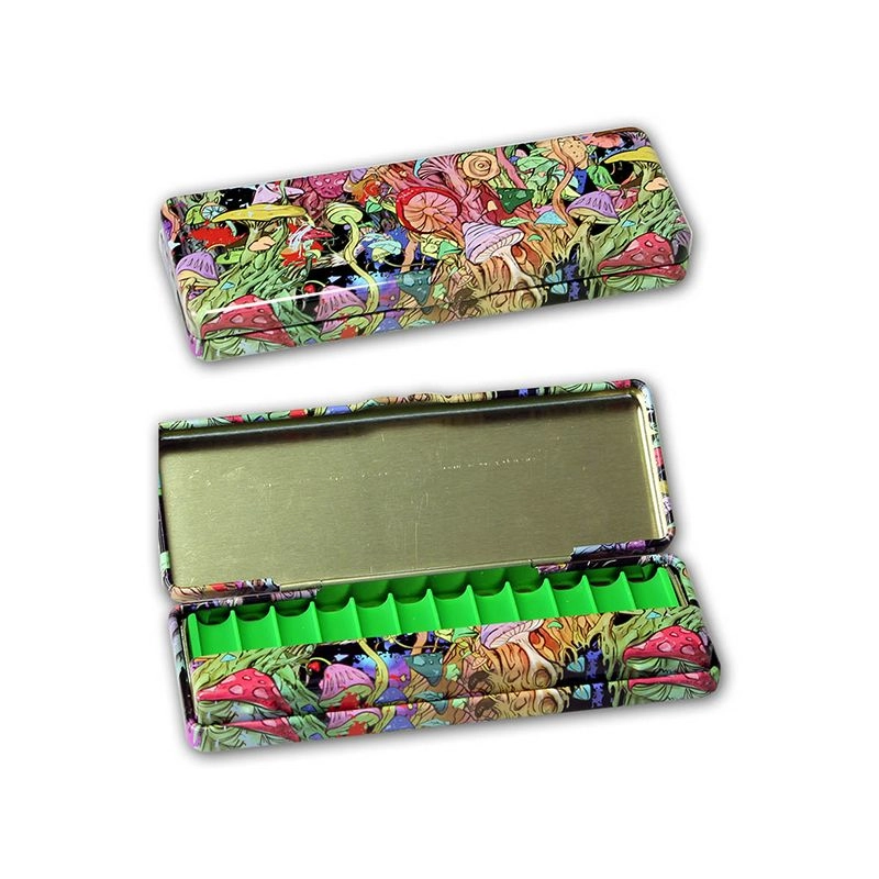 Cool bedruckte Aufklappdose aus Weißblech mit herausnehmbarer Silikoneinlage, die darauf wartet, mit den notwendigsten Utensilien, nämlich Papers und Aktivkohlefilter, befüllt zu werden. Ideal für unterwegs!