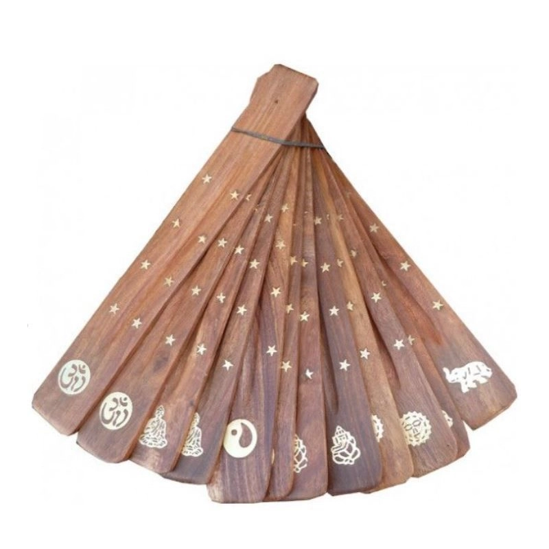 Räucherstäbchenhalter aus Holz zum Abbrennen eines Räucherstäbchens mit goldenem Motiv als Dekoration